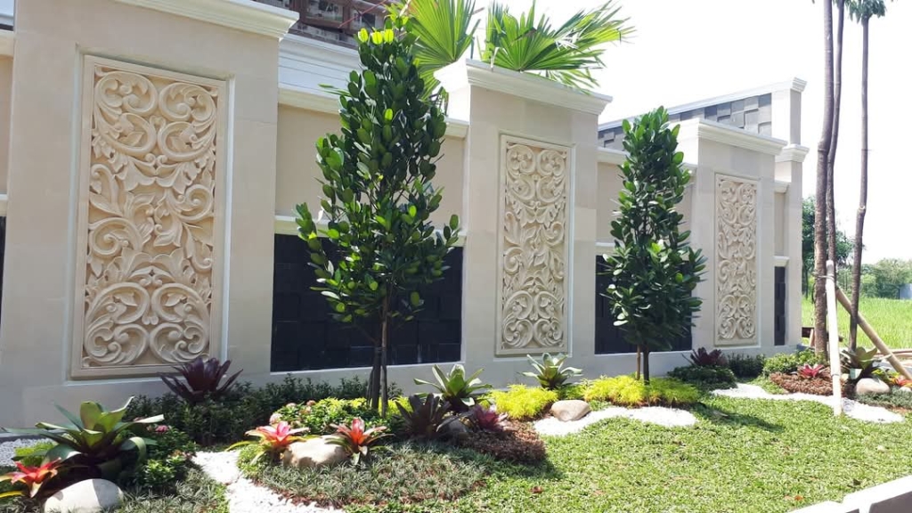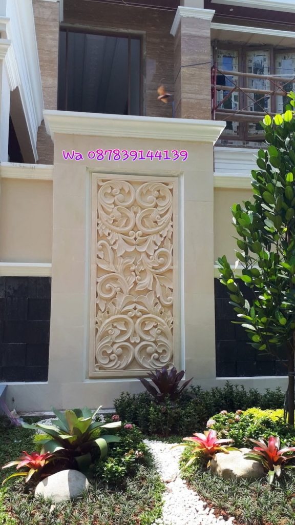 ukiran batu alam jogja motif minimalis dengan ukuran lebar 80cm tinggi 200cm tebal batu 5cm dipasang ditembok pagar. terbuat dari batu alam paras jogja warna putih dengan proses pengerjaan membutuhkan waktu 1 minggu. batu alam jogja memiliki tekstur yang sedikit berpori dan tahan lama terhadap perubahan cuaca. batu alam jogja sangat cocok untuk hiasan dinding eksterior maupun interior.
