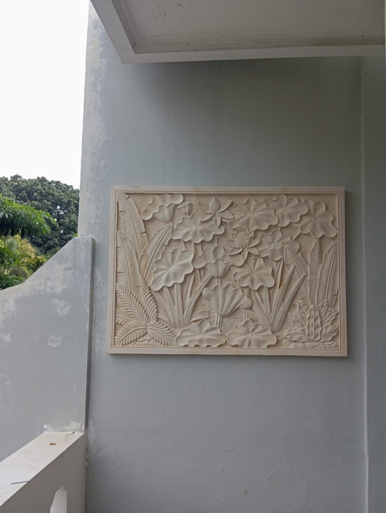 | Kategori | batu hiasan dinding, batu paras jogja, batu putih, batu ukir, dekorasi rumah, hiasan dinding, kerajian batu alam, motif lotus |